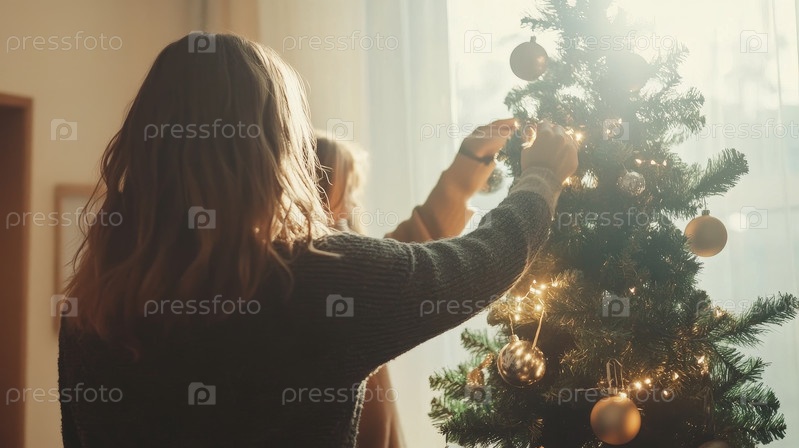 Уютная семья украшает рождественскую елку в теплой праздничной атмосфере