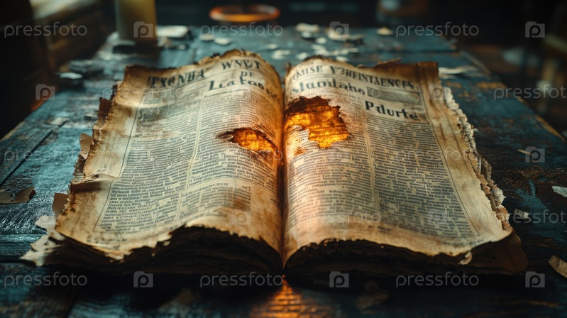 Древняя сгоревшая книга со светящимися дырками на старом деревянном столе