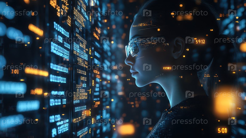 Лицо женщины с наложенным цифровым кодом, погруженное в футуристическую технологическую среду, символизирует пересечение человека и технологий