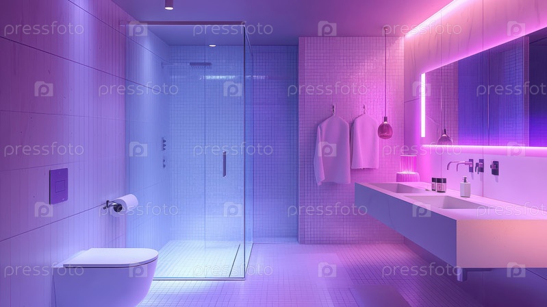 Элегантная футуристическая ванная комната с минималистичным дизайном, неоновой подсветкой, стеклянной душевой кабиной и современной сантехникой, создающей спокойную и роскошную атмосферу