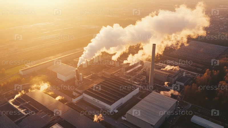 На этом снимке с воздуха запечатлен промышленный завод с солнечными панелями, испускающими дым, под заходящим солнцем