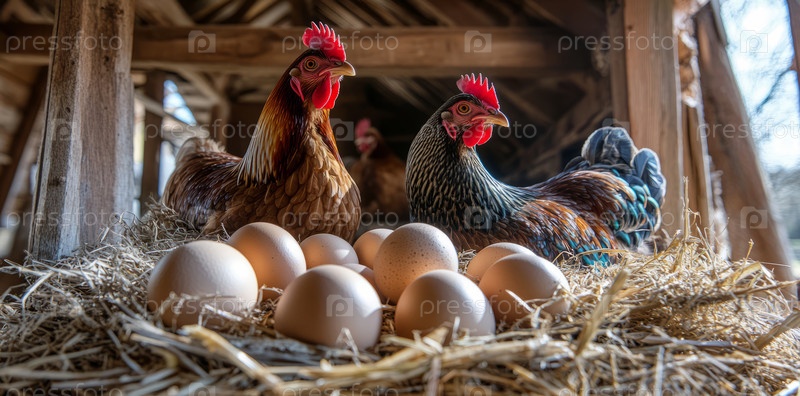 Куры, гнездящиеся в уютном сарае со свежеснесенными яйцами