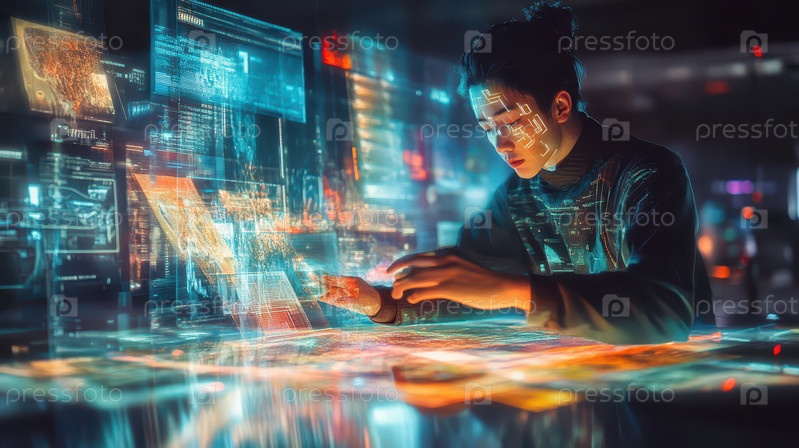 Киберпанк-хакер работает над голографическим интерфейсом в футуристической лаборатории