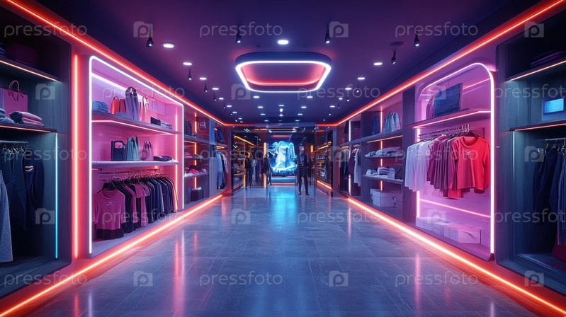 Футуристическая неоновая витрина магазина модной одежды со стеклянными витринами