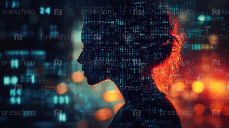 Силуэт женщины с цифровым кодом в стиле киберпанк