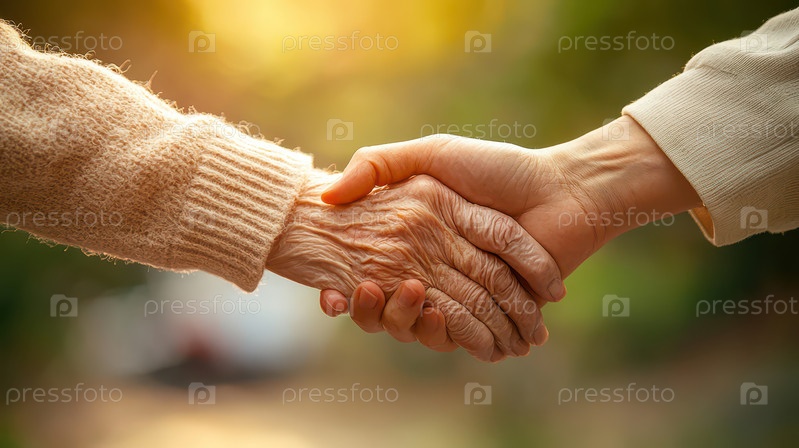 Руки пожилых и молодых людей пожимают друг другу в теплом жесте