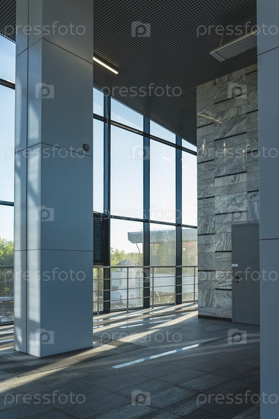 Современный интерьер здания с большими стеклянными окнами и естественным освещением