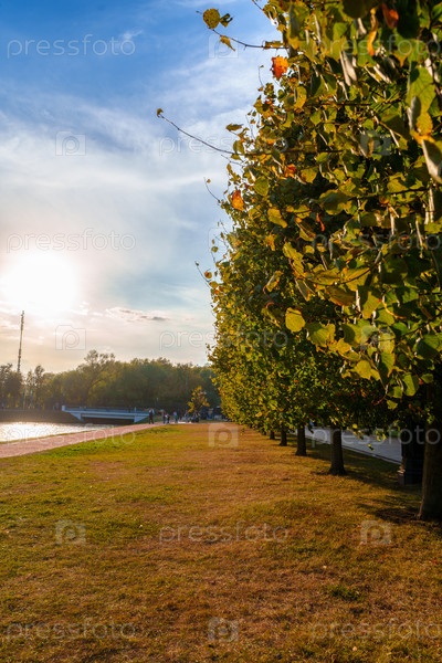 Осенний парковый пейзаж с золотистой травой и деревьями на закате