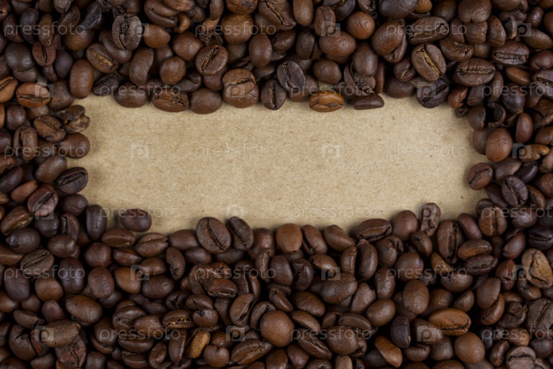 Обжаренные кофейные зерна обрамляют пустое пространство из крафт-бумаги