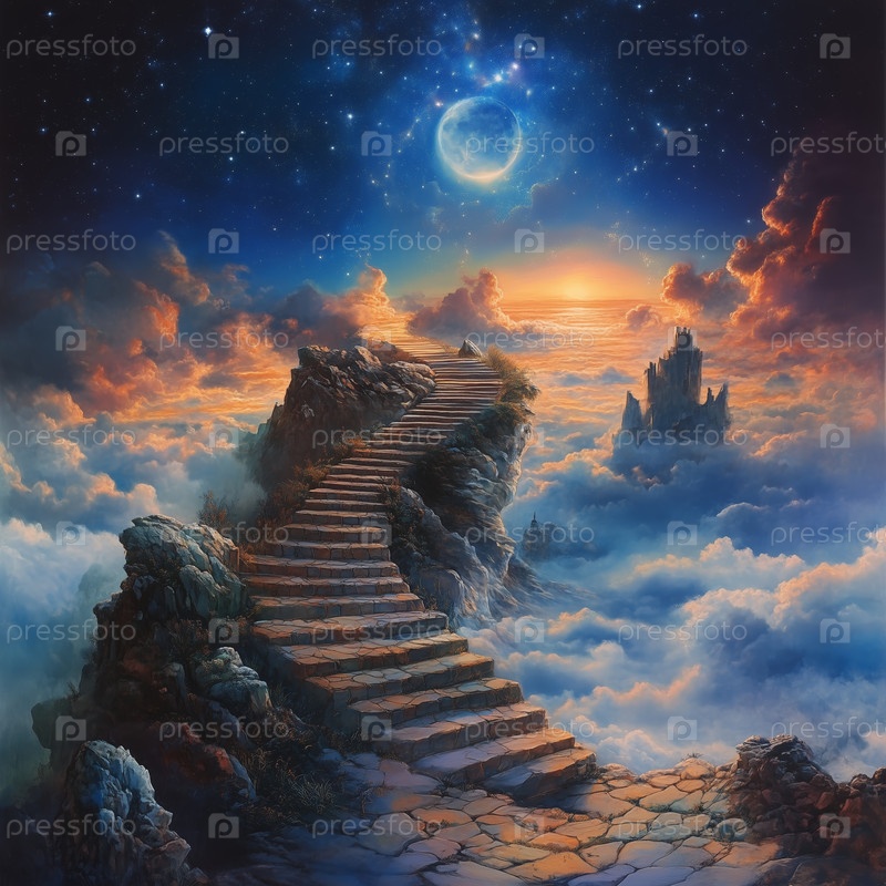 Каменная лестница, ведущая к сюрреалистическому небесному пейзажу