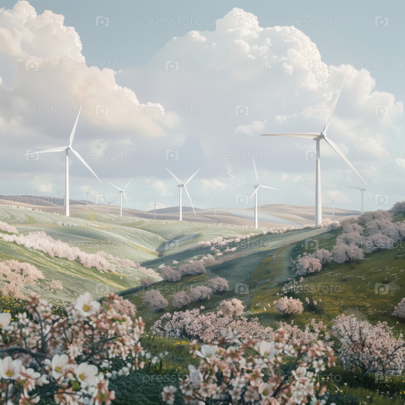 Ветряные турбины на холме с полевыми цветами