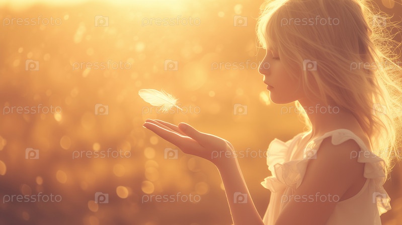 Женщина в золотом свете, окруженная падающими листьями