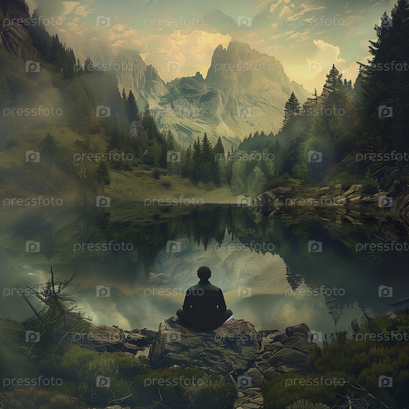 Человек в глубокой медитации на фоне захватывающего пейзажа