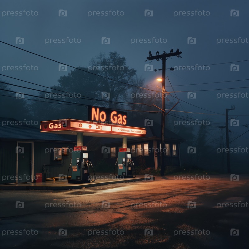 Ночная заправка с неоновыми вывесками и туманной атмосферой
