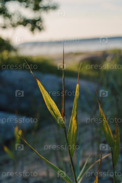 Крупный план прибрежной травы на размытом фоне моря на закате