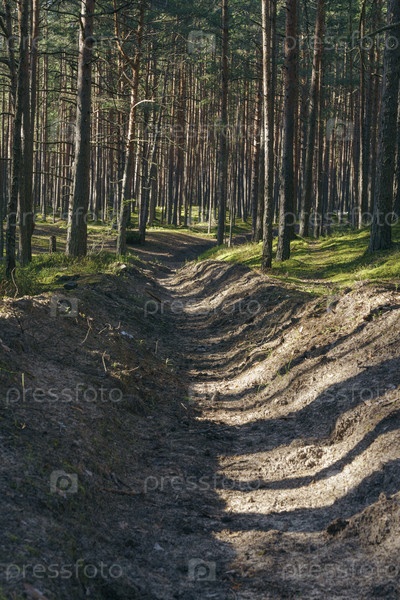 Грунтовая тропа, петляющая через густой сосновый лес в солнечном свете