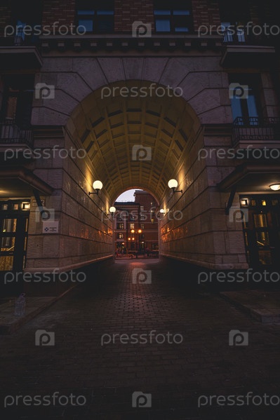Освещенная городская арка в сумерках с уличными фонарями
