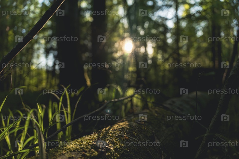 Солнечный свет проникает сквозь деревья на лесную почву со мхом и травой