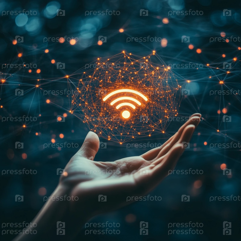 Рука, представляющая светящийся беспроводной символ в цифровой среде