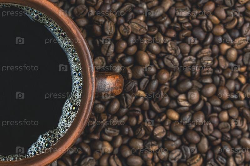 Наполовину наполненная чашка кофе на подложке из жареных кофейных зерен