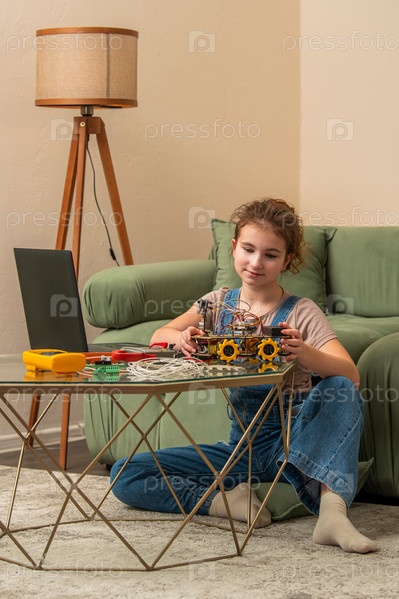 Молодая девушка сосредоточена на создании модели робота дома, сидя на полу с ноутбуком рядом. Инструменты и провода разбросаны на столе, запечатлевая момент концентрации и обучения