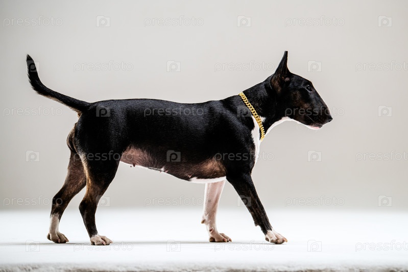 Бультерьер с золотой цепью уверенно стоит на нейтральном фоне. Его осанка и настороженное выражение лица говорят об элегантности и силе, отражая особый характер породы