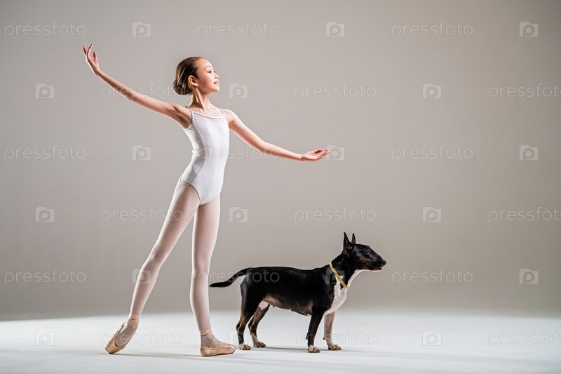 Молодая японская девушка элегантно позирует в балетном наряде рядом с хорошо воспитанной собакой. Она демонстрирует грациозные движения, иллюстрирующие гармонию между человеком и питомцем в спокойной обстановке студии