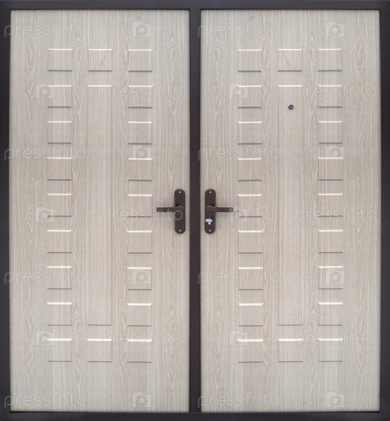 Двустворчатая входная металическая дверь, изолированная на белом фоне