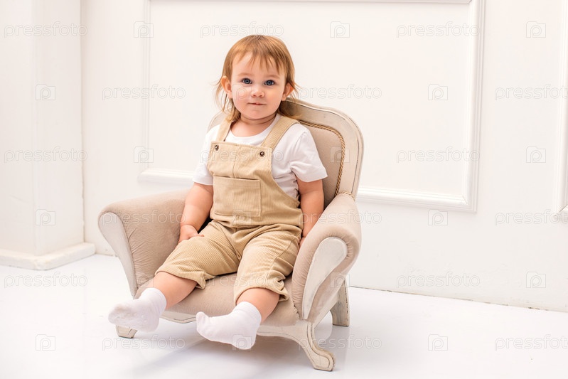 Милый малыш удобно сидит на маленьком кресле в винтажном стиле в светлой, элегантной комнате. Ребенок одет в бежевый комбинезон и белую футболку. Нейтральные тона и классический декор создают теплую, стильную обстановку