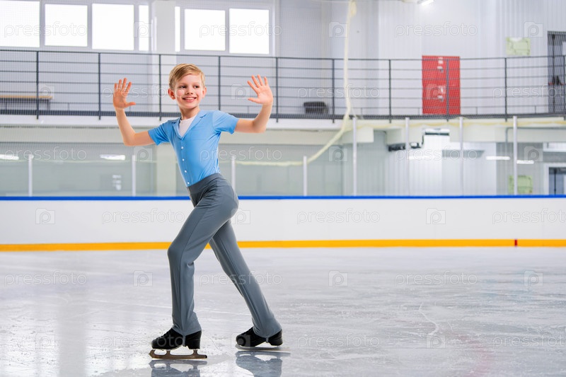 Юный фигурист катается на льду крытой ледовой арены и выполняет трюк