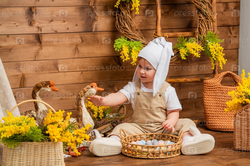 Улыбающийся малыш в шапочке-кролике сидит с корзиной пасхальных яиц в сельской весенней обстановке