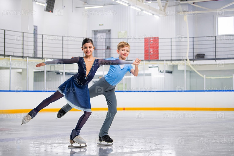 Юные фигуристы в элегантных танцах на льду - спортивные пары на соревнованиях, изолированные на белом фоне