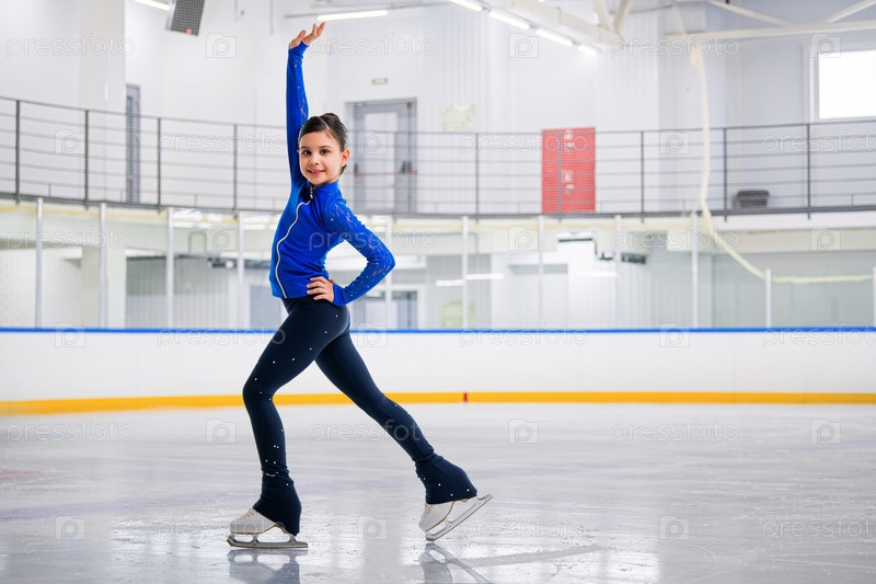 Юная девушка-фигуристка катается на льду с улыбкой на лице. Она одета в синий спортивный костюм
