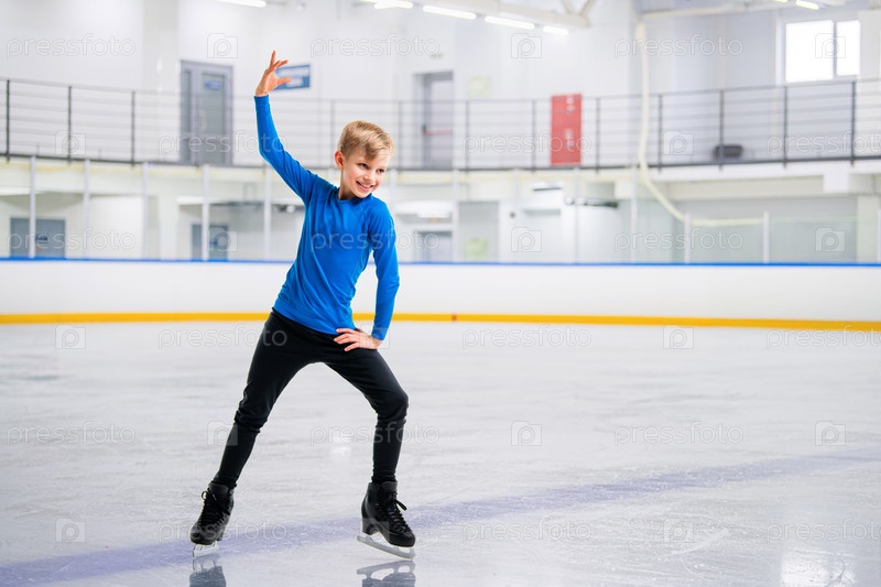 Юный фигурист катается на льду крытой ледовой арены