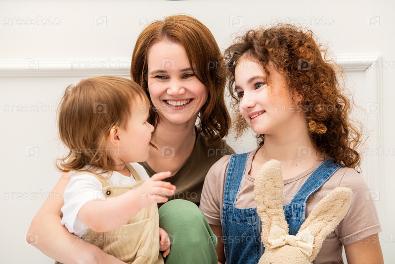 Любящая мать сидит со своими двумя дочерьми в ярком минималистичном интерьере. Их теплые выражения и уютные наряды создают трогательный и нежный семейный момент