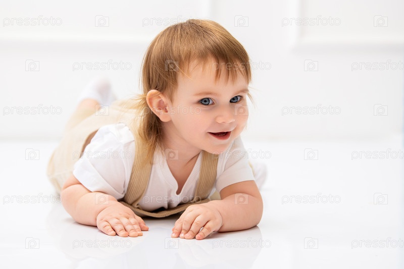 Радостный малыш с ярко-голубыми глазами и светло-каштановыми волосами лежит на отражающем белом полу, весело улыбаясь. Смех и естественное счастье ребенка создают трогательную и игривую сцену