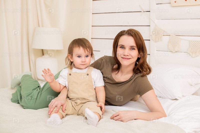 Веселый малыш играет на уютной кровати с любящей мамой. Гармоничное развитие и забота в атмосфере дома и семьи