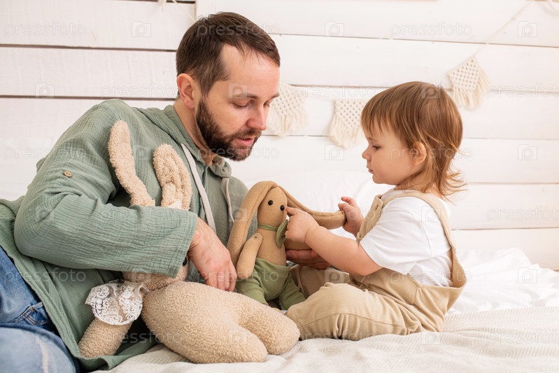 Малыш играет на уютной кровати с папой. Гармоничное развитие и обучающие игры в атмосфере дома