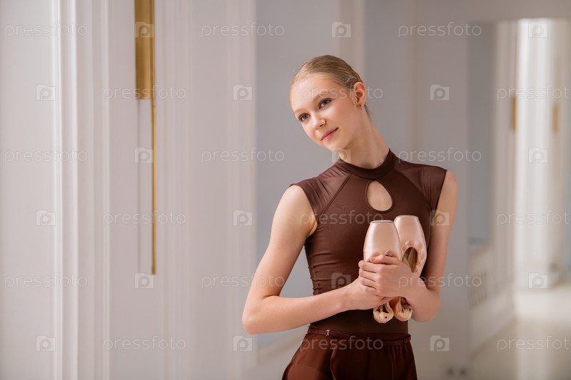 Юная балерина в танцевальной студии держит пуанты со спокойным выражением лица, одетая в элегантный танцевальный костюм, демонстрируя момент спокойного размышления перед тренировкой