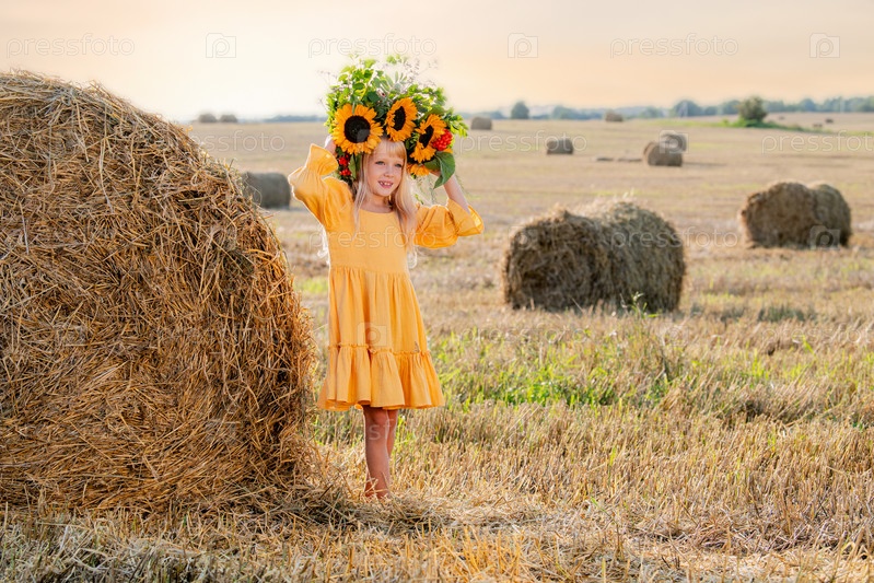 Молодая девушка в ярком венке из подсолнухов и желтом платье прислонилась к стогу сена на залитом солнцем поле. Праздник урожая