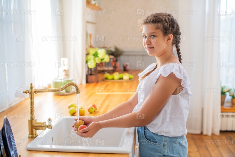 Молодая девушка моет яблоки под краном на яркой кухне, нежно улыбаясь. Солнечный свет проникает через окна на деревянные столешницы, создавая теплую и уютную атмосферу