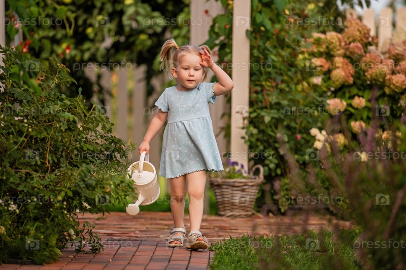 Маленькая девочка в синем платье идет по садовой дорожке, держа в руках лейку. Зелень и цветы окружают ее, создавая теплую летнюю атмосферу