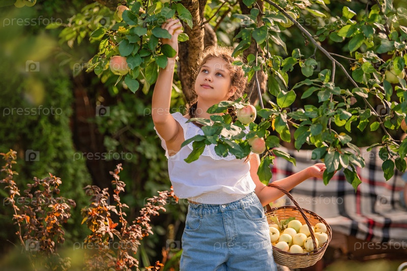 Молодая девушка в соломенной шляпе стоит под яблоней, осторожно собирая спелые яблоки в плетеную корзину, полную желтых яблок