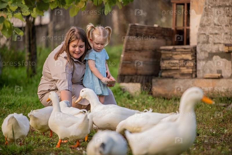 Мать и ее две дочери кормят белых уток на сельской ферме, наслаждаясь мирным отдыхом на свежем воздухе