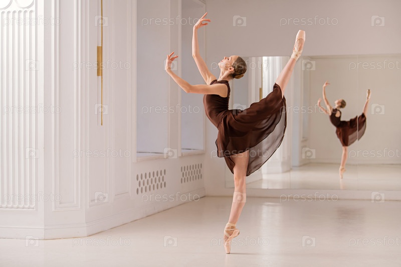 Балерина грациозно исполняет позу пируэта в танцевальной студии. Выражение сосредоточенности и элегантности танцовщицы подчеркивает красоту и дисциплину балетной техники