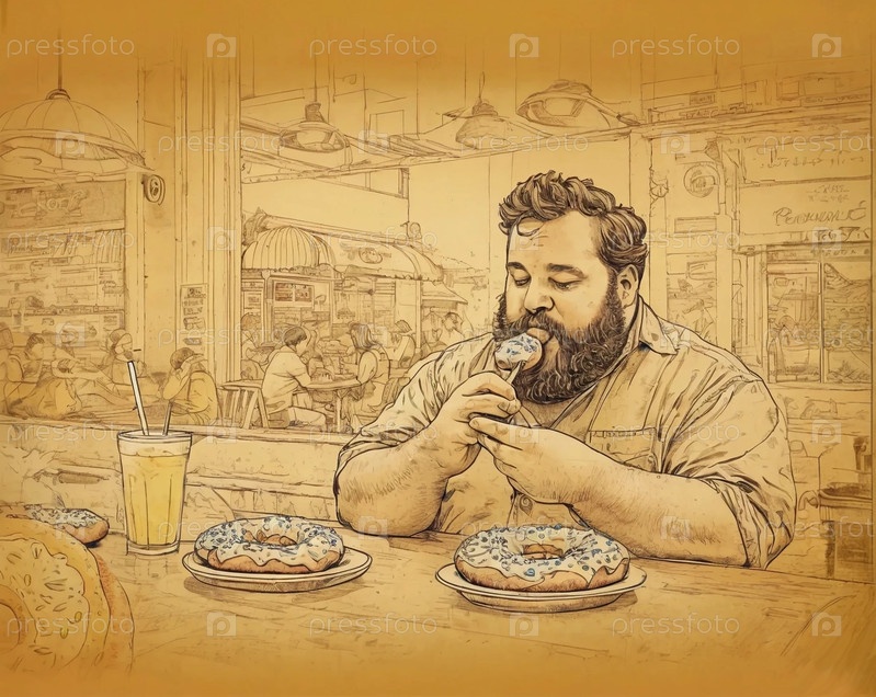 Толстый мужчина ест пончик, пиццу и лимонад в кафе