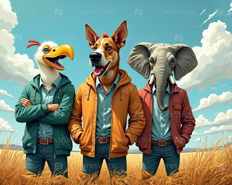 Мужчины с головой птицы, собаки и слона стоят в поле