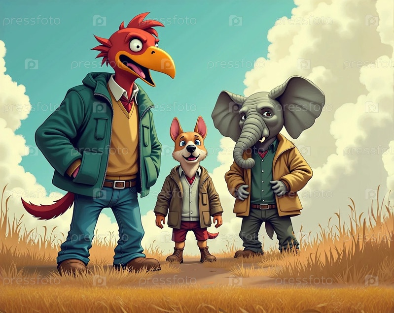 Мужчины с головой птицы, собаки и слона стоят в поле