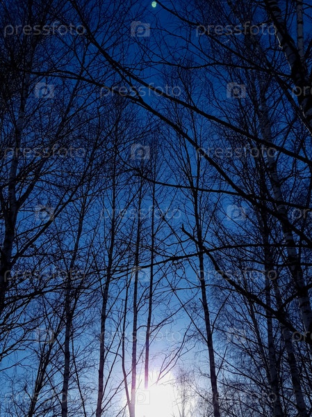 Ветви охватывают сумерки, когда солнце садится за безмятежный лес в зимней прохладе, отбрасывая мягкие силуэты на фоне глубокого синего неба