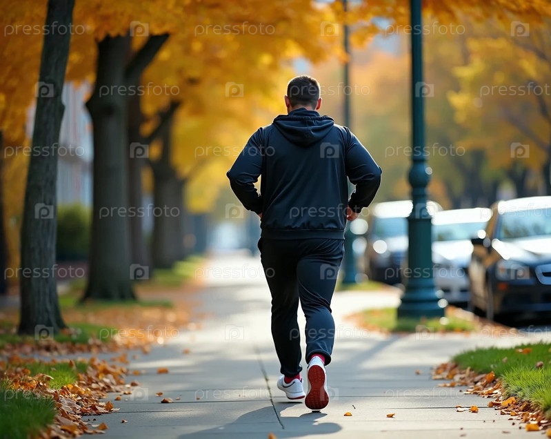 Толстый мужчина в спортивном костюме бежит по тротуару в городе